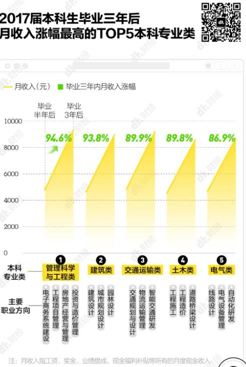 麥可思研究追蹤了2017屆本科畢業(yè)生的收入狀況,對比他們畢業(yè)半年后和畢業(yè)三年后的薪資發(fā)現(xiàn),畢業(yè)三年內(nèi)月收入平均漲幅最高的,是管理科學(xué)與工程類專業(yè)。